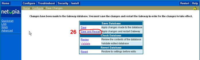 Í 26 klikkar þú á Save and Restart, þá vistar routerinn þessar stillingar og endurræsir sig. Það tekur nokkrar sek.