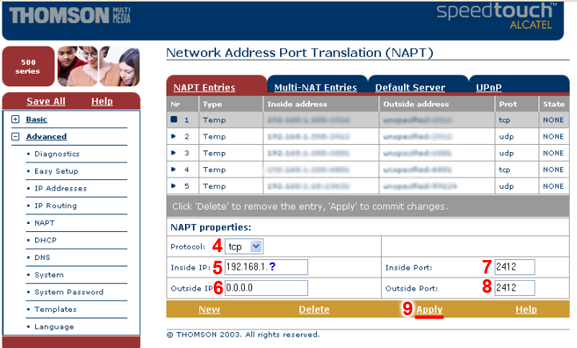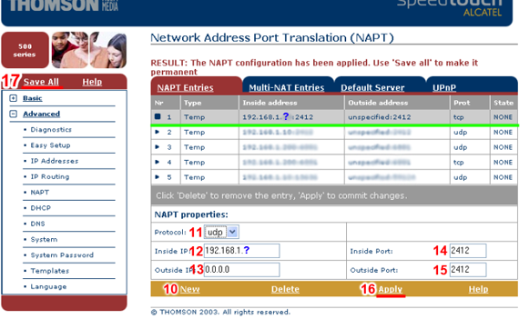 með SpeedTouch 590). Smelltu á "NEW". "Protocol" á að vera tcp. Í "Inside IP" á að setja töluna úr "IP Address" úr "ipconfig". Í "Outside IP" á að setja 0.0.0.0 Í "Inside Port" á að vera 2412 Í "Outside Port" á að vera 2412 Síðan smellirðu á "Apply". Smelltu síðan á "NEW" aftur. "Protocol" á að vera udp. Í "Inside IP" á að setja töluna úr "IP Address" úr "ipconfig". Í "Outside IP" á að setja 0.0.0.0 Í "Inside Port" á að vera 2412 Í "Outside Port" á að vera 2412 Smelltu síðan á "Apply". Smelltu á "Save All", Efst vinstra megin á