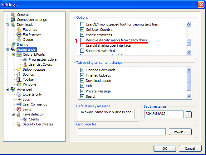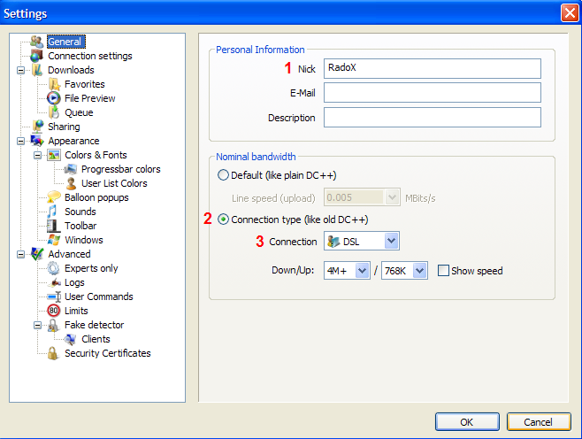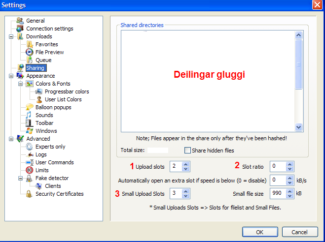 StrongDC 2.01 stillingar