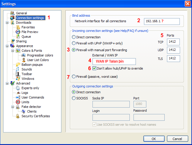 5. Stilltu TCP/UDP/TLS á portið sem þú notar (1412 eða 2412 er gott að nota)