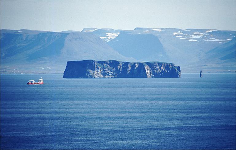 Drangey, an island (180 m) in Skagafjörður with the cliff Kerling at right