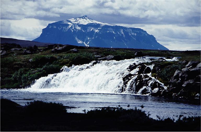 A waterfall in Grafarlandaá river with Herðubreið (1682 m) 25 km away